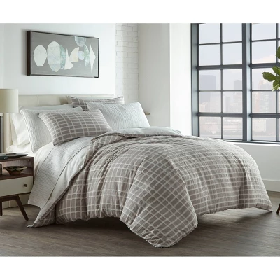 A simple urban grid pattern in gray and white is softened with clipped fringe outlines that make a graphic statement with a relaxed attitude. The all-cotton set is available in both gray and white. The cool soft fabric is breathable for maximum comfort in all seasons. Works beautifully alone or layered with our tally quilt set for additional style and comfort. Duvet cover features a zipper closure with tailored edges and is machine washable for easy care. The twin duvet set includes: one twin duvet cover (88″L x 68″W)and one standard sham (21″L x 27″W); the full/queen duvet set includes: one full/queen duvet cover (88″L x 88″W) and two standard shams (21″L x 27″W); the king duvet set includes: one king duvet cover (88″L x 104″W) and two king shams (21″L x 37″W).