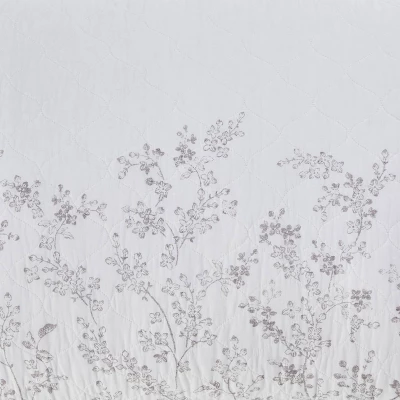 The charming Laura Ashley Flora quilt set boasts a delicate cascading gray floral pattern on a white ground. The flowers are densely printed at the bottom of the quilt and slowly scatter away from one another towards the top of the quilt. This gorgeous quilt reverses to a gray and white diamond pattern. Prewashed for softness, this 100% cotton quilt set becomes cozier with each wash. Filled with a blend of 80% cotton/20% poly it is light weight yet can be layered for year-round use. Set includes one quilt and two shams for full/queen and king size, one sham for twin size. Machine washable for easy care
